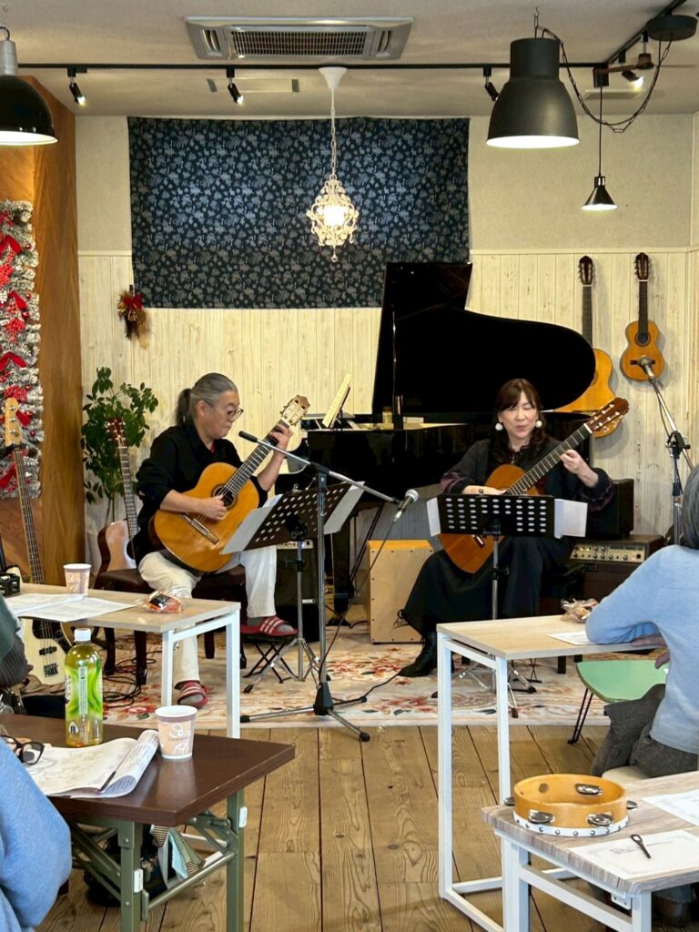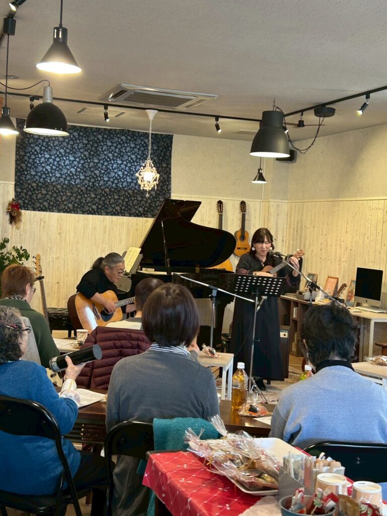 休憩時間にはドリンクとお菓子でひと息。講師による演奏として、本格的なギター曲やピアノ独奏のプレゼントもあり、音楽に浸る時間となりました。