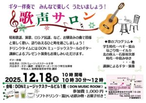 ギター伴奏でみんなで楽しく歌いましょう! 12月18日木曜日10時30分よりDONミュージックスクールにて歌声サロンを開催します。参加費は1000円です。どなたでも参加できますので、お友達を誘っておいでください。 会場の […]